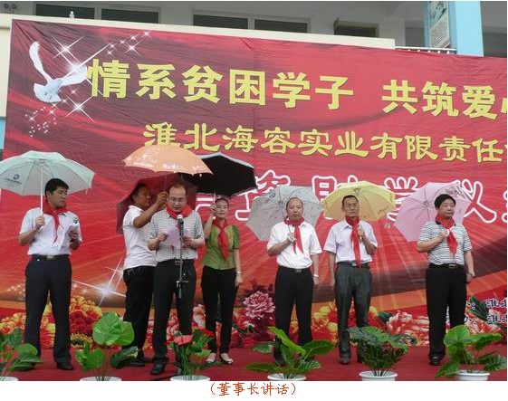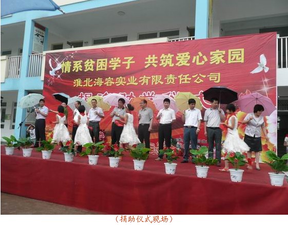 愛化春雨潤校園,企業(yè)點滴獻愛心, 6月30日上午,海容實業(yè)公司董事長徐毅及總經(jīng)理石啟遠出席了為渠溝鎮(zhèn)合眾小學(xué)捐資助學(xué)儀式,本次捐資助學(xué)儀式由淮北相山區(qū)政府教育局主辦、海容實業(yè)有限責(zé)任公司承辦,海容公司董事長及總經(jīng)理在助學(xué)儀式上作了精彩的講話,對學(xué)校師生們表示了深切關(guān)懷,并希望能夠盡企業(yè)的綿薄之力為學(xué)校的孩子們獻一份愛心,讓企業(yè)的關(guān)愛溫暖整個校園,合眾小學(xué)的代表向海容實業(yè)這一善舉表達了的感激之情,并表示會利用好這筆助學(xué)金,操場上孩子們臉上洋溢著喜悅的笑容,并上臺為企業(yè)代表及相山區(qū)教育局的工作人員佩戴了鮮艷的紅領(lǐng)巾,儀式結(jié)束后企業(yè)代表、教育局工作人員與合眾小學(xué)的學(xué)生們合影留念。
